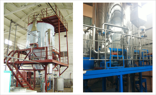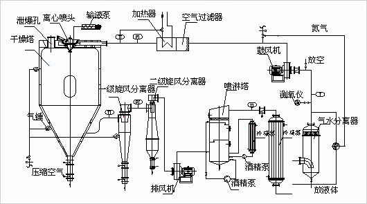 首先在干燥塔體內(nèi)充入被加熱的氮?dú)?,被干燥的液態(tài)物料經(jīng)輸液泵輸送至噴頭處,液態(tài)物料被霧化器霧化成細(xì)小液滴,液滴在干燥塔內(nèi)與熱氮?dú)膺M(jìn)行充分的熱交換,物料中的液態(tài)部分被瞬間蒸發(fā),固態(tài)部分形成的粉狀物料沉于塔底,干燥的粉狀物料從塔底排出。其中,被蒸發(fā)的有機(jī)溶劑氣體在風(fēng)機(jī)的作用下,通過旋風(fēng)分離器、噴淋塔等裝置把附著在氣體中的粉塵進(jìn)行除塵處理,再經(jīng)冷凝器把除塵后飽和有機(jī)溶劑氣體冷凝成液體排出冷凝器。其間,作為干燥介質(zhì)的惰性氣體被連續(xù)加熱后作為干燥載體在系統(tǒng)內(nèi)重新循環(huán)使用。